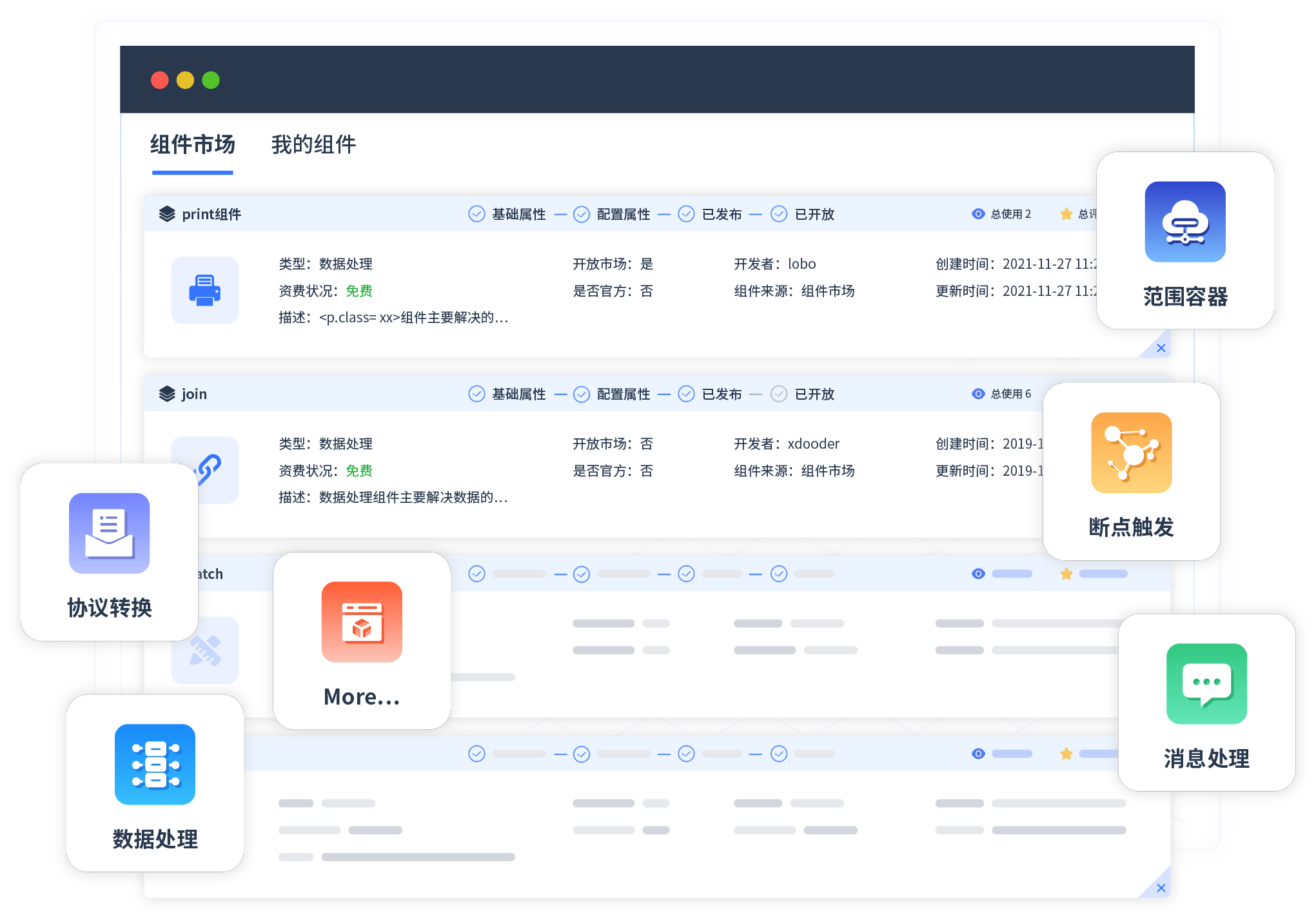 针对集成场景,,CGPAY钱包提供组件市场,,,,例如协议转换、、、消息处理、、文件操作等。。。。除平台提供的组件外,,,客户可以自定义所需组件。。。。