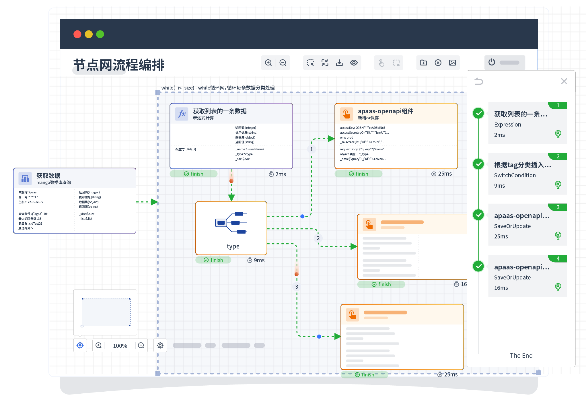 针对集成场景,,,,组件定义后支持进行流程编制,,,不同于传统代码方式,,通过图形化展示,,支持在线调试、、、日志查看和运行回放。。